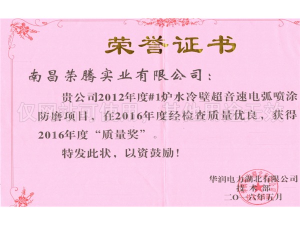 超音速電弧噴涂榮譽證書